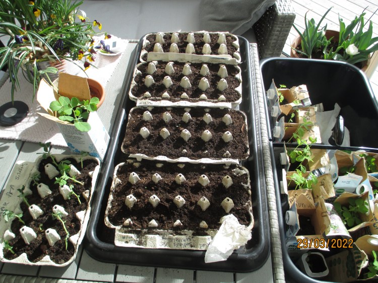 Mina äggboxar räckte inte för detta försök, så jag frågade grannarna om de kunde ‘skänka’ sina istället för att slänga? Det gick ju mycket bra, jag fick många ‘grannboxar’ under vintermånaderna. Eftersom de är staplingsbara, krävdes ingen stort utrymme för att lagra dem.