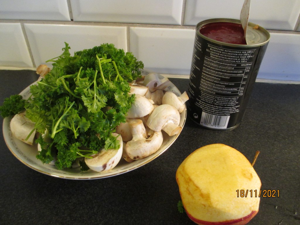 Förutom en burk tomatkross, syns champinjoner, persilja och ett äpple i bilden. Lägg till lite chili krydda, salt och peppar, matgrädde eller annan favorit mejeriprodukt plus en del vita bönor, kan det bli en god chili con carne av det hela.
