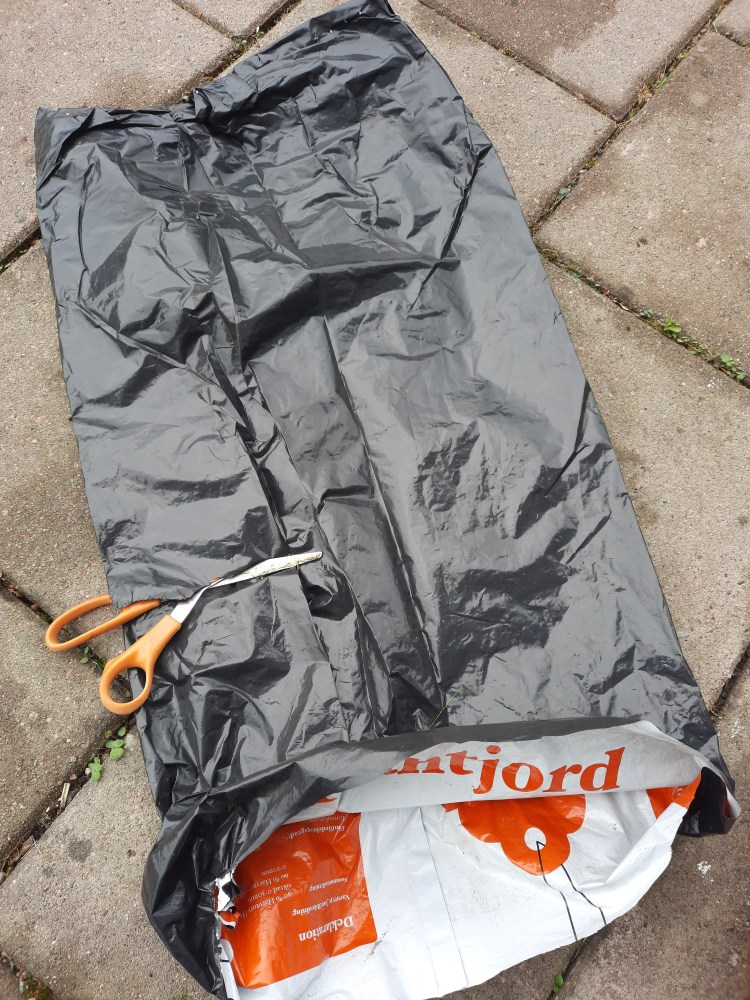 Klipp ut en lagom stor bit markväv som räcker för att klä insidan av stativet. Dock se till att den är såpass hög så den kan gömma plastpåsen samt räcka för att kunna vika ner en liten topp kant (se bilden längst ned).