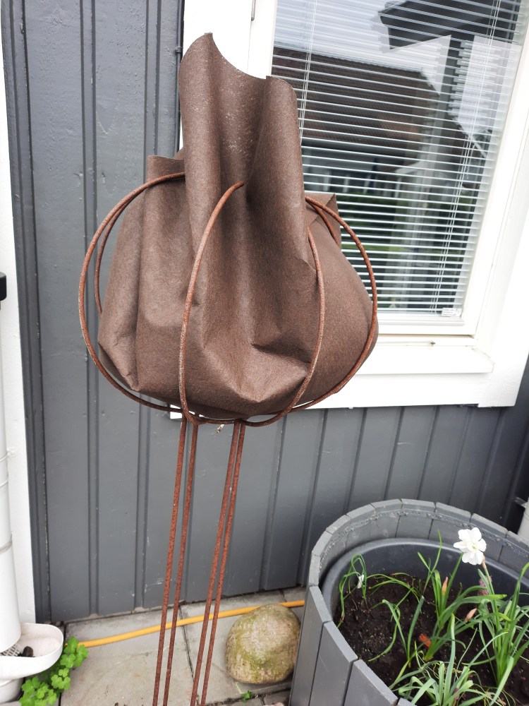 Eftersom järnstället är högt, lade vi på några stenar som tyngd på bas plattan. Detta för att få det att stå stadigt. Dessutom placerades stället intill en vägg, återigen för att minska ‘fall risk’ vid riktigt blåsigt väder.