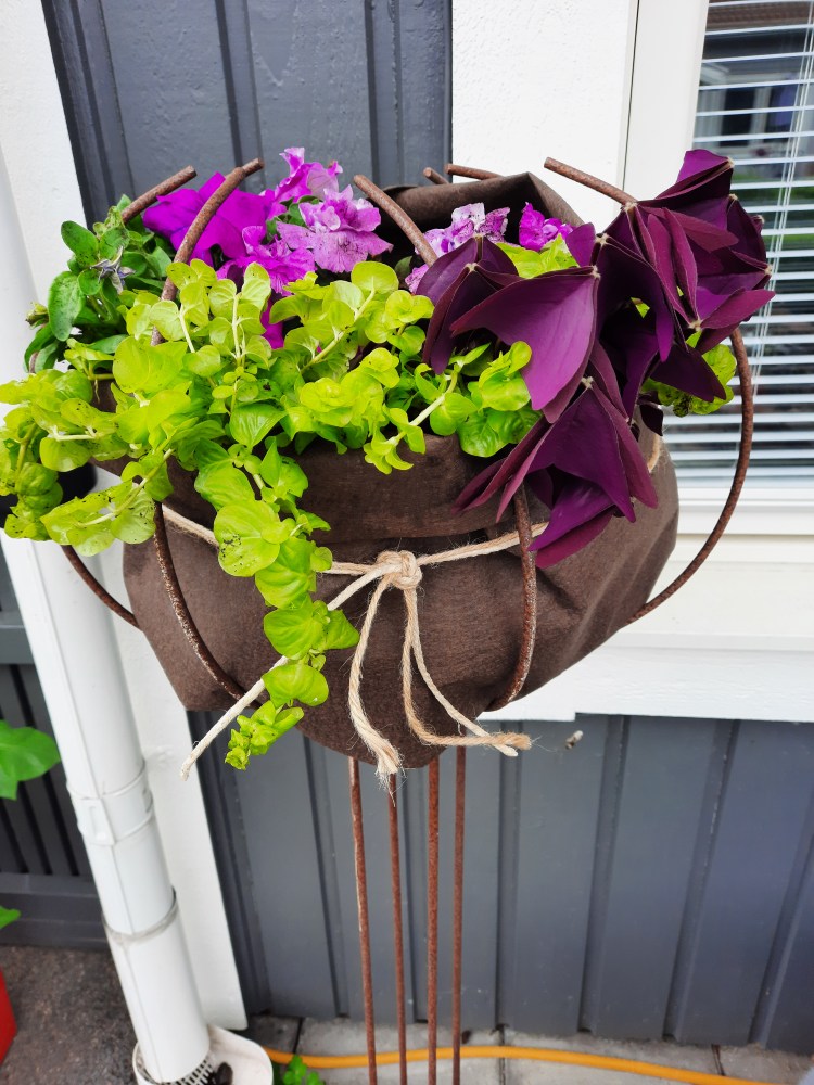 När markvävs korgen är färdig är det dags att placera ut plantorna. När du är nöjd, drar ihop och snygga till markväven. Dekorera gärna med något snyggt runtom, jag tog en bit gammalt snöre till dekoration (syns i nästkommande bild).