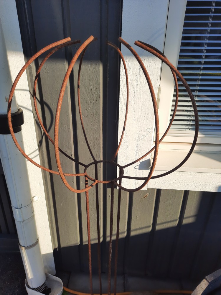 För ett par år sedan tog vi fram ett gammalt järn ställ vilket har fungerat som hållare för soldriven belysning. Tidigare hade det huserat ett arrangemang av sommar blommor, och vi tyckte det var dags att återigen använda det för samma syfte. En ‘gör det själv’ enkelt och billigt projekt !!